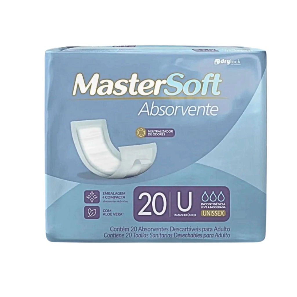Absorvente Geriátrico Mastersoft (20 unidades): Equipado com fita adesiva para fixação segura, combina suavidade e alta absorção, proporcionando proteção e conforto mesmo em situações de incontinência, moderada